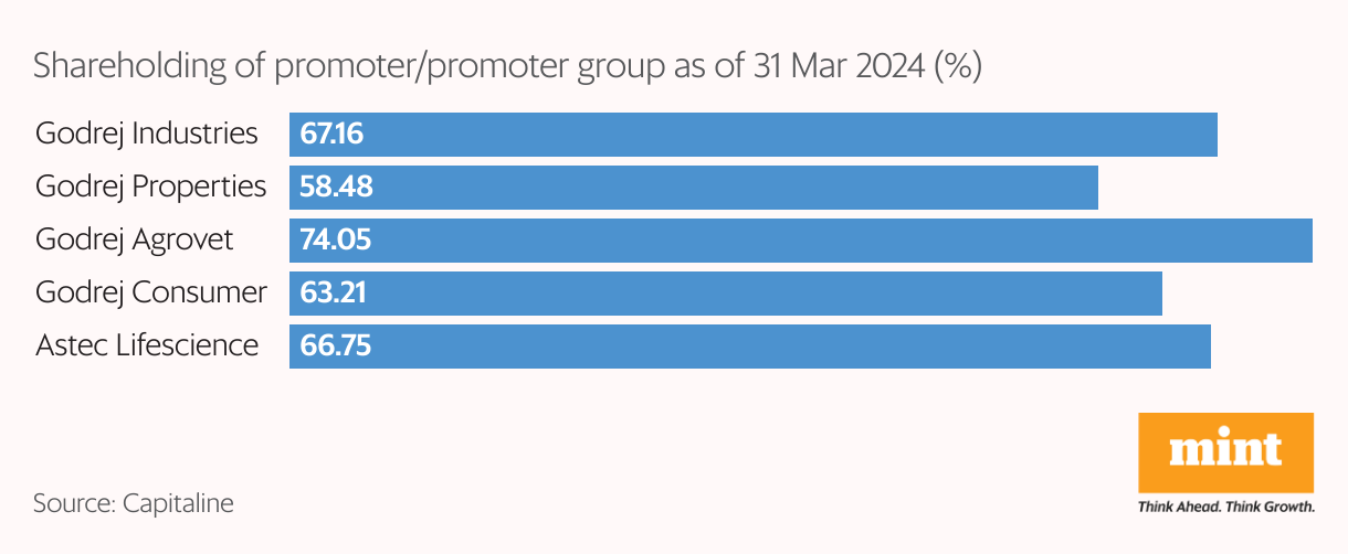 Earlier in the day, shares of listed Godrej Industries Ltd closed 5.78% higher on the BSE at ₹960.65, and Astec LifeSciences gained 4.99%. Shares of other listed group companies moved less than 1%, while the benchmark Sensex index closed 0.25% lower.